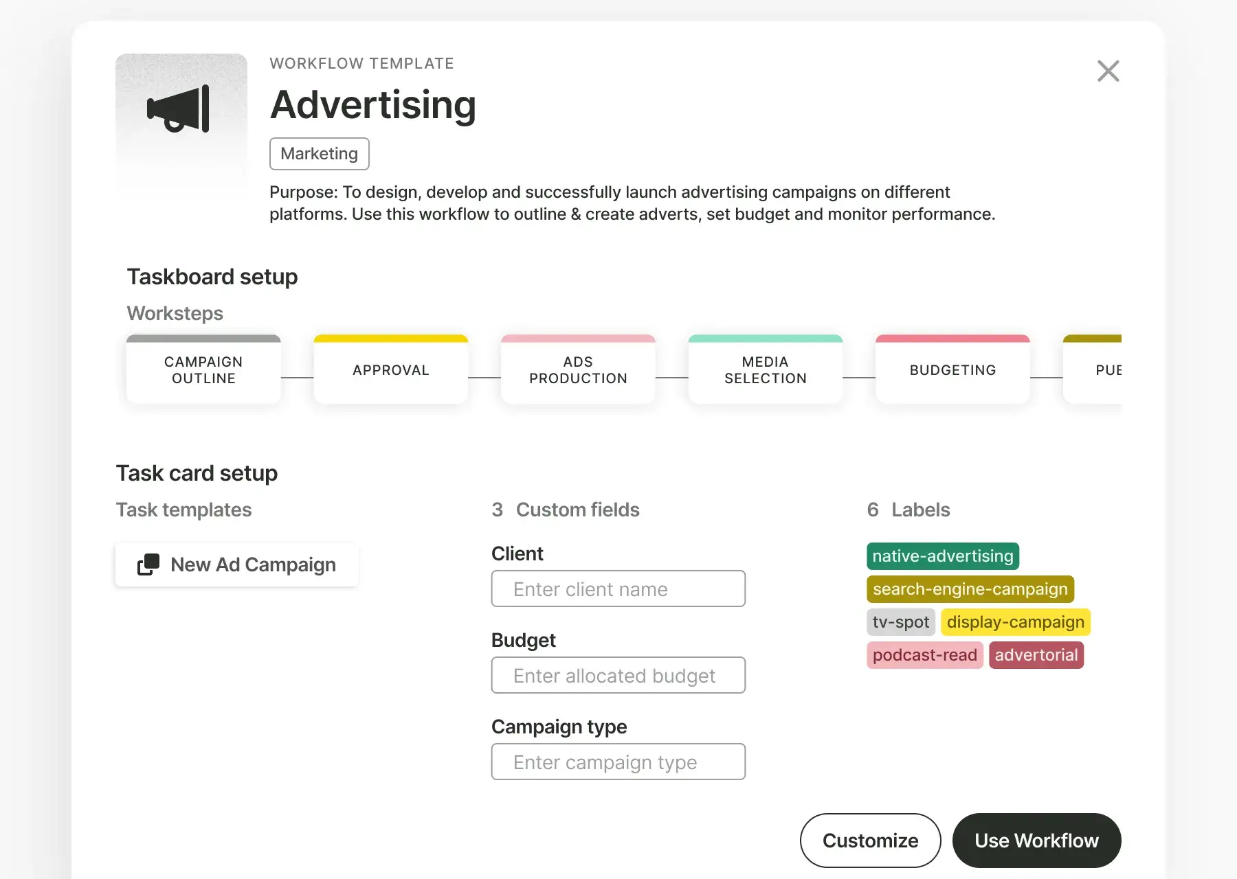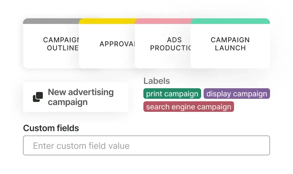 Whether it's starting out with your initial marketing plan, managing social media campaigns, or developing a brand positioning strategy, our workflows are designed to fit your agency's unique needs. Every workflow encompasses the steps a task must follow from initiation to completion, along with customized task templates, labels, and custom fields tailored to your agency's requirements. By utilizing our workflows, you can ensure consistency, efficiency, and positive outcomes across all your agency's projects.