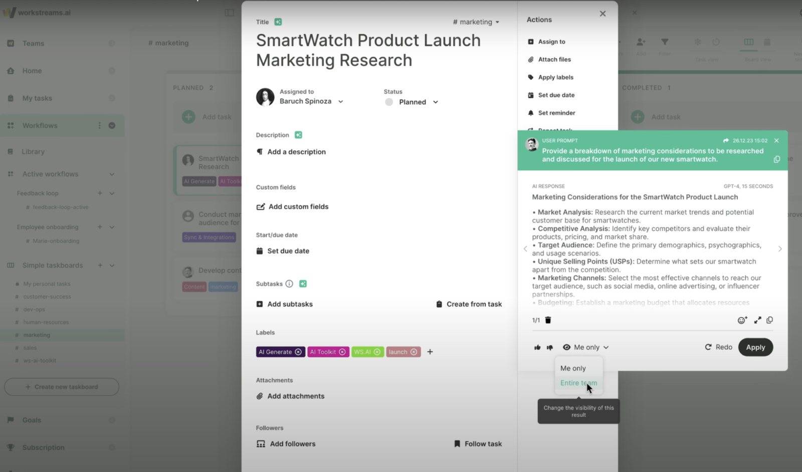 The workstreams.ai AI tool generates content (like task descriptions or subtasks) based on the task details or your specific instructions. It lets you improve the previous input and stores all past versions for easy access.