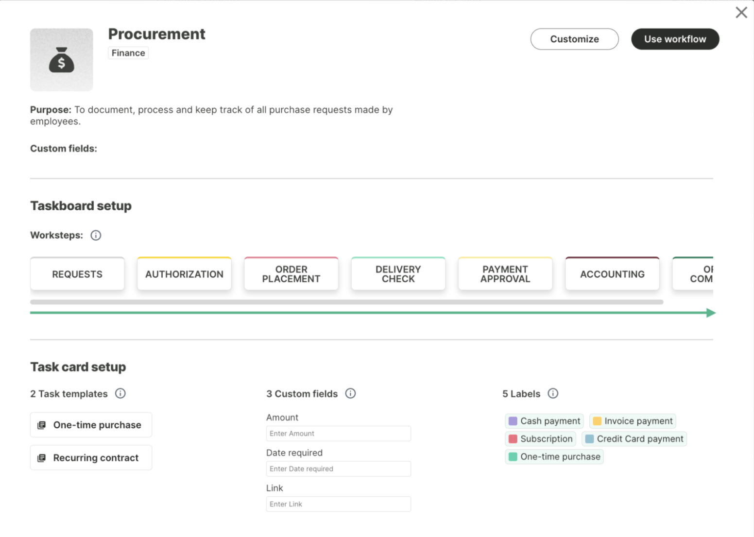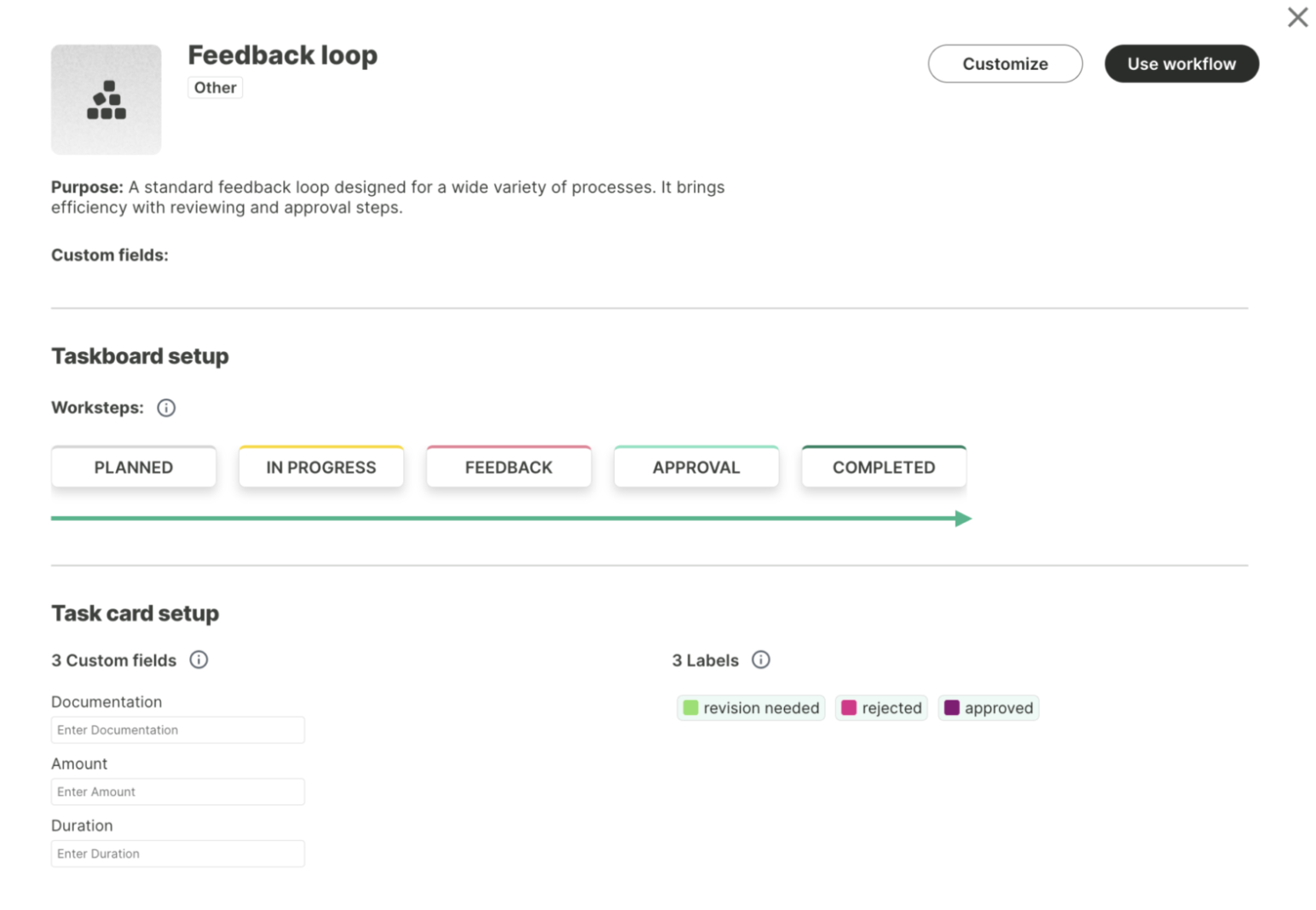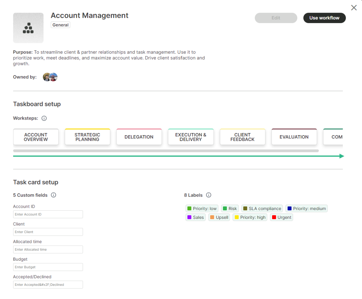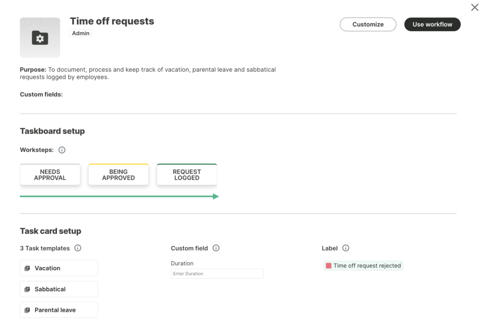 Workflows are the main building block used to standardize your organization’s processes. This is done through a customizable Taskboard and Task Templates.