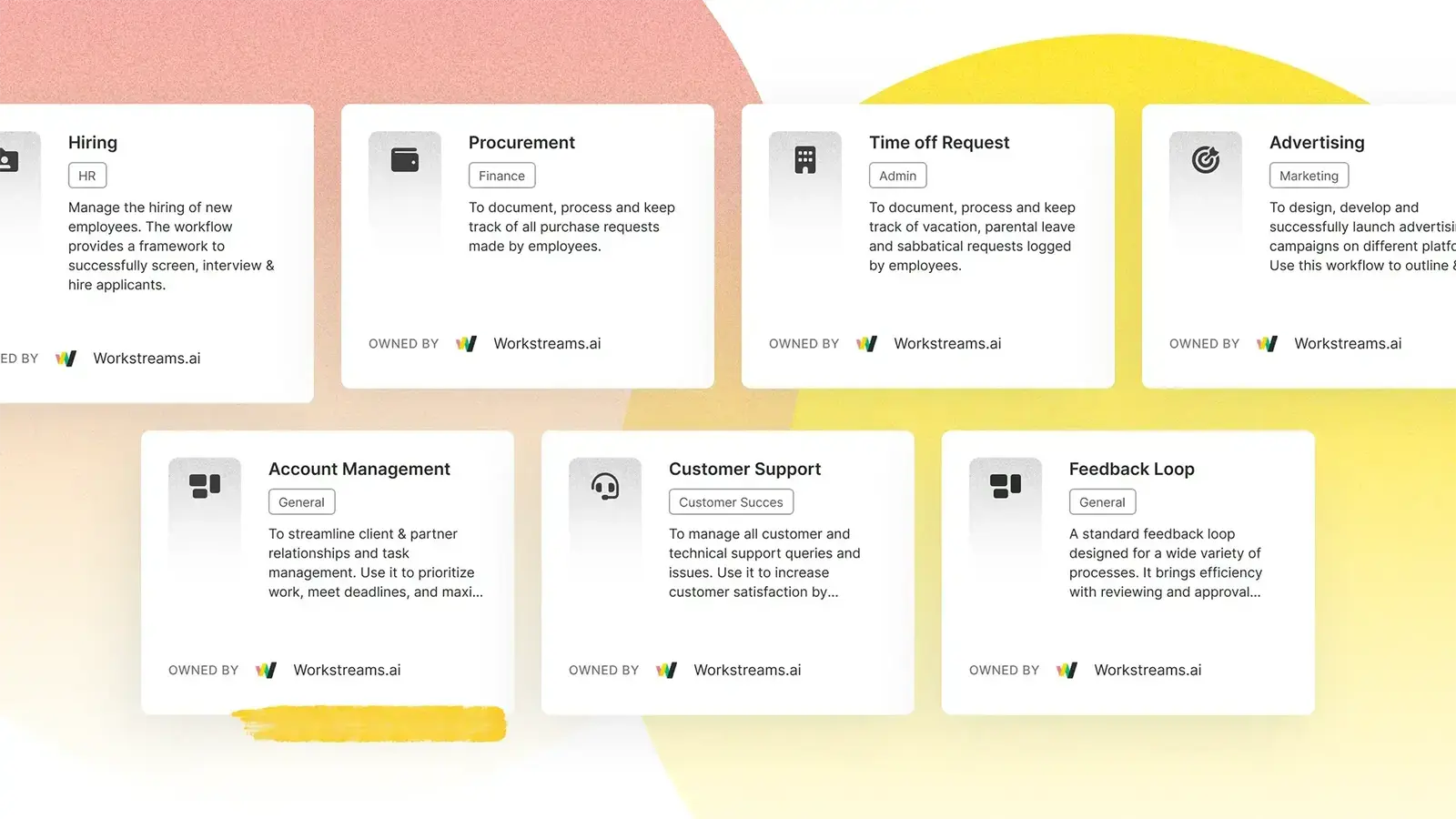 Workflows aim to cover up to all processes within your organization at any given time. Examples of Workflows include: Account Management, Customer Support, or Advertising.