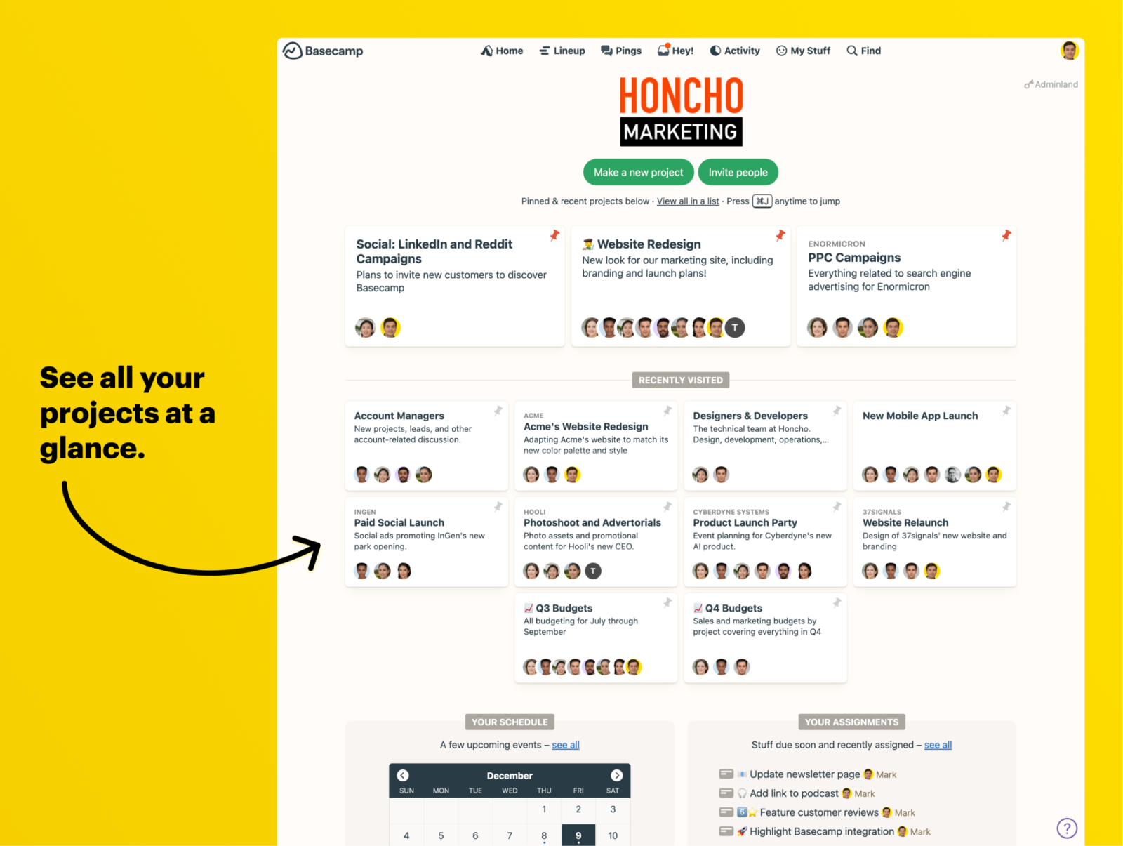 Die letzte Airtable-Alternative aus unserer Liste ist Basecamp. Es konzentriert sich auf ein minimales Design, was ein Vorteil sein kann, aber für viele große Teams eher ein Nachteil ist, da es keine fortgeschrittenen Organisationsoptionen erlaubt.Die wichtigsten Funktionen dieses Projektmanagement-Tools sind:
