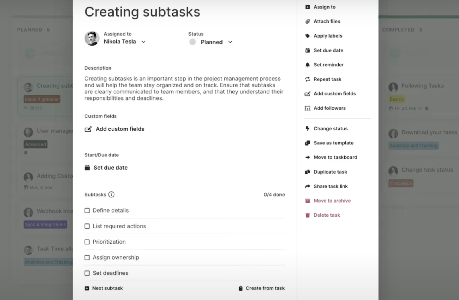 Außerdem kann jede Teilaufgabe mit zusätzlichen Details angereichert werden, genau wie die Hauptaufgaben. Du kannst jede Teilaufgabe verschiedenen Teammitgliedern zuweisen und jeder Teilaufgabe ein eigenes Fälligkeitsdatum geben.