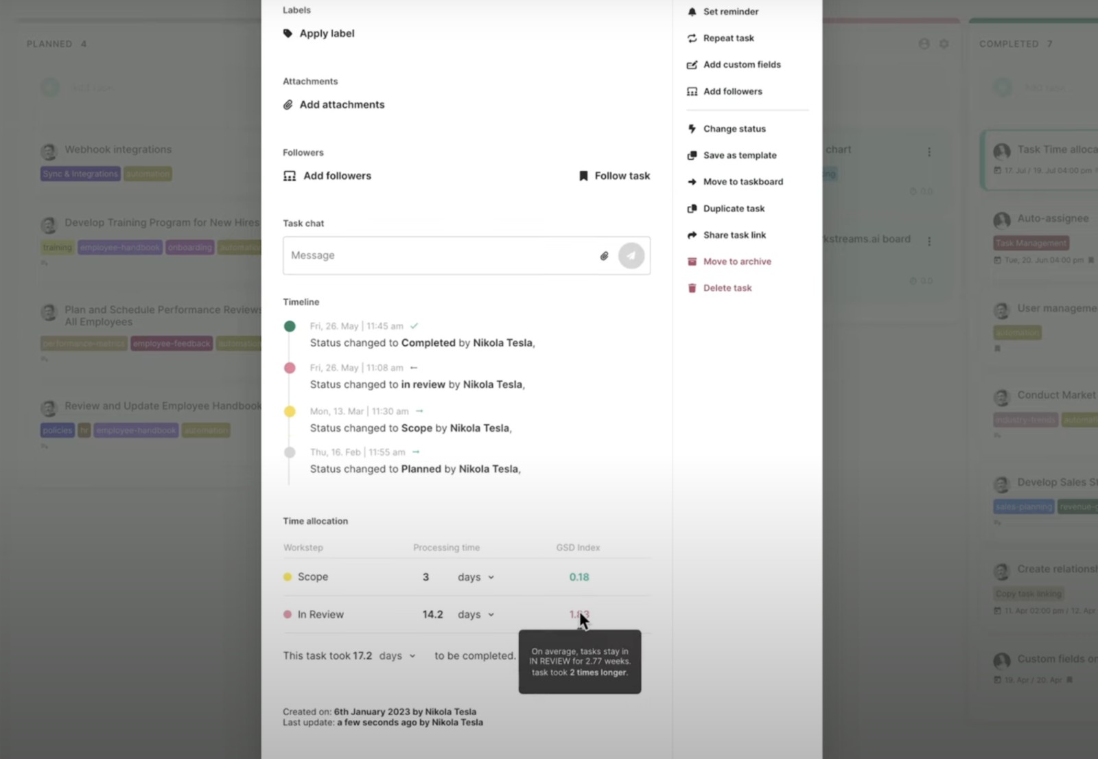 Mit dieser Funktion kannst du Engpässe in Echtzeit erkennen, eine Workflow-Analyse durchführen und deine Workflows optimieren. Außerdem kannst du die Zeit, die sie für die Erledigung einer Aufgabe gebraucht haben, mit der durchschnittlichen Erledigungszeit vergleichen, und wenn sie deutlich niedriger ist, kannst du zusätzliche Schulungen oder Hilfe anbieten.