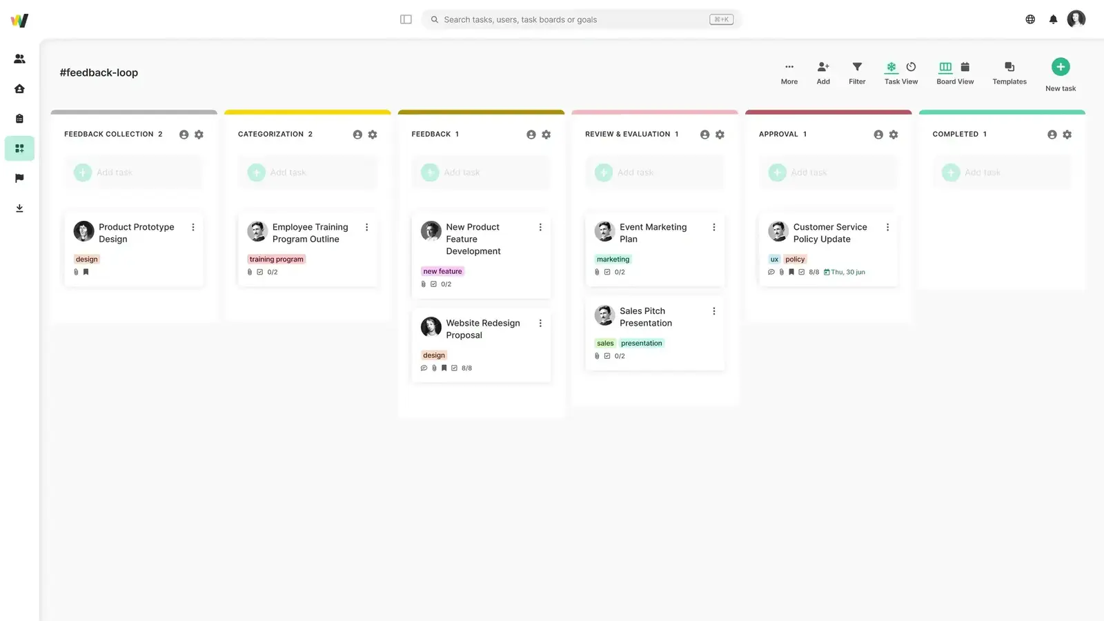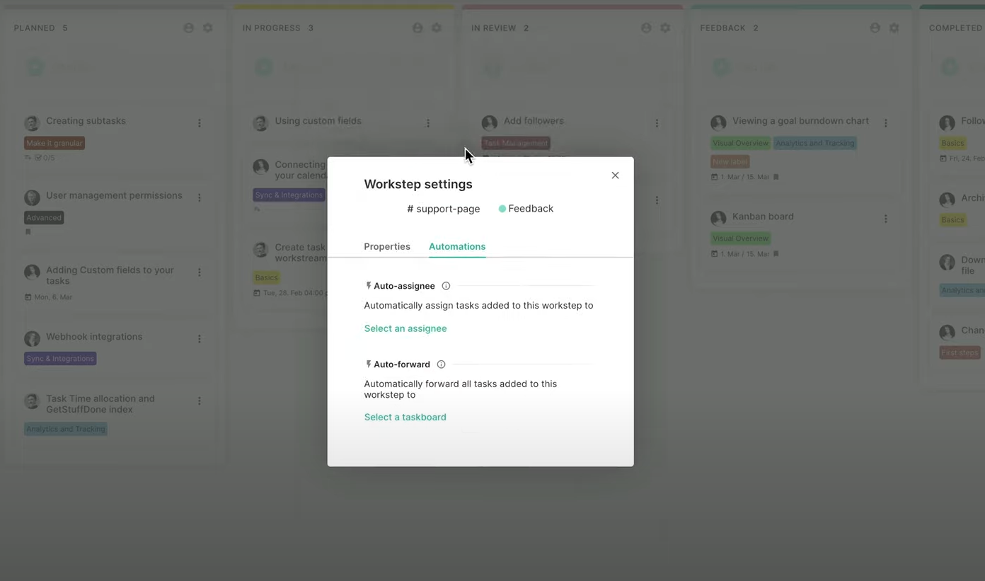 Es ist nicht nötig, Aufgaben manuell von einem Taskboard in ein anderes zu verschieben, wenn sie einen bestimmten Schritt im Prozess erreichen. Du kannst Weiterleitungsregeln einrichten, sodass eine Aufgabe automatisch an ein anderes Taskboard weitergeleitet wird, sobald sie einen bestimmten Schritt erreicht hat. Wenn zum Beispiel eine Aufgabe im Taskboard deines Grafikdesigners fertig ist, kann sie zur Genehmigung an das Taskboard deines Content Managers weitergeleitet werden.