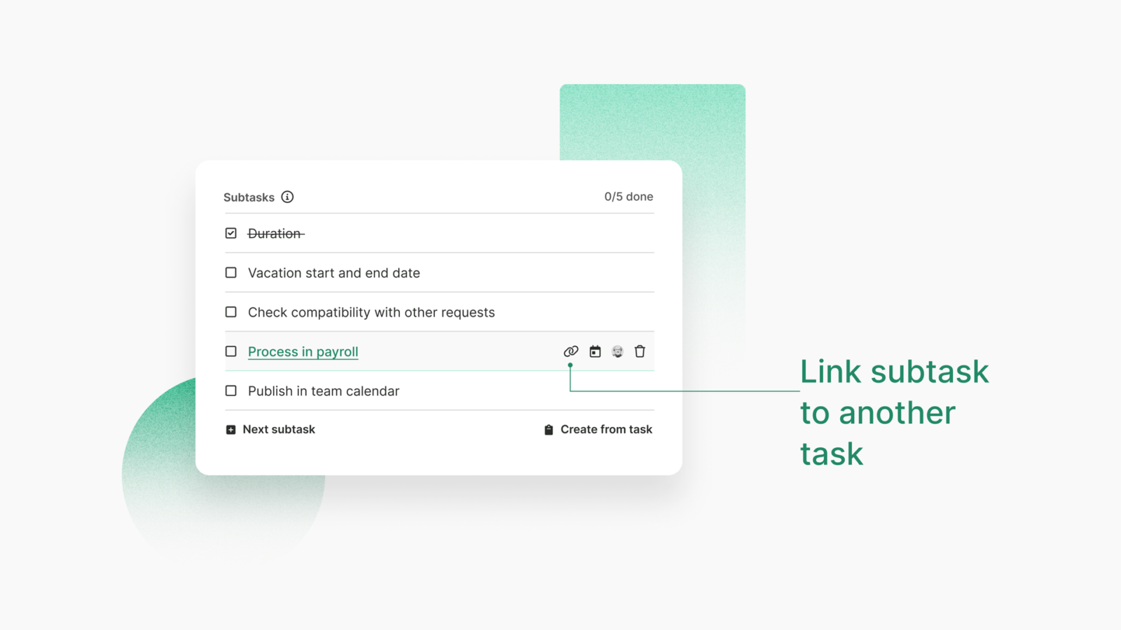 Mit unserer Workflow-Management-Software kannst du Teilaufgaben und bestehende Aufgaben miteinander verknüpfen, um Doppelarbeit zu vermeiden. Nehmen wir zum Beispiel an, du bist Projektmanager und weist einem Mitarbeiter eine Teilaufgabe zu. Dieser erstellt daraufhin eine neue Aufgabe für sich selbst, die mit deiner Teilaufgabe identisch ist. Du kannst diese beiden Aufgaben miteinander verknüpfen, so dass, wenn der Mitarbeiter seine Aufgabe abschließt und abhakt, auch die entsprechende Teilaufgabe in deiner Checkliste abgehakt wird, um Verwirrung zu vermeiden und sicherzustellen, dass ihr auf derselben Seite steht.