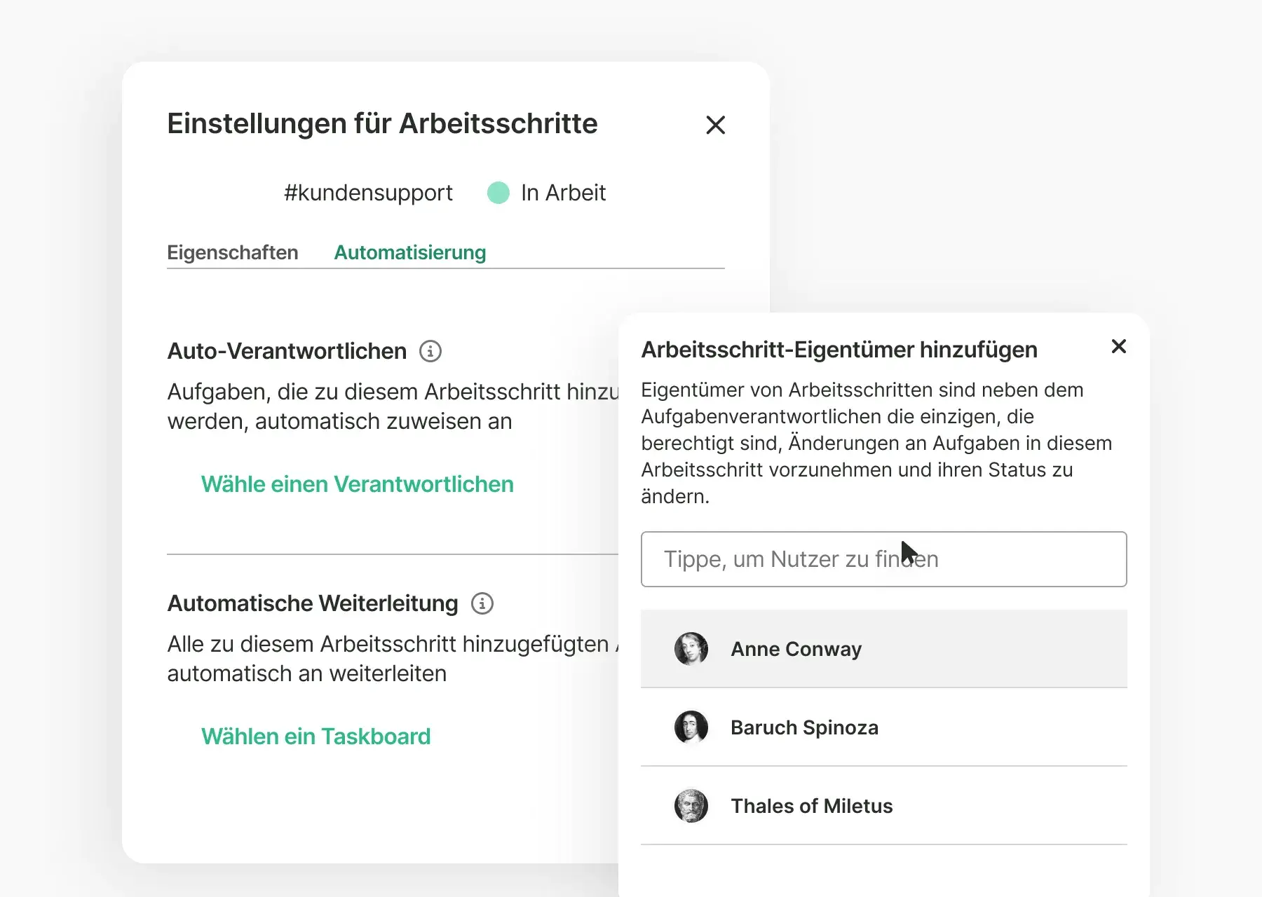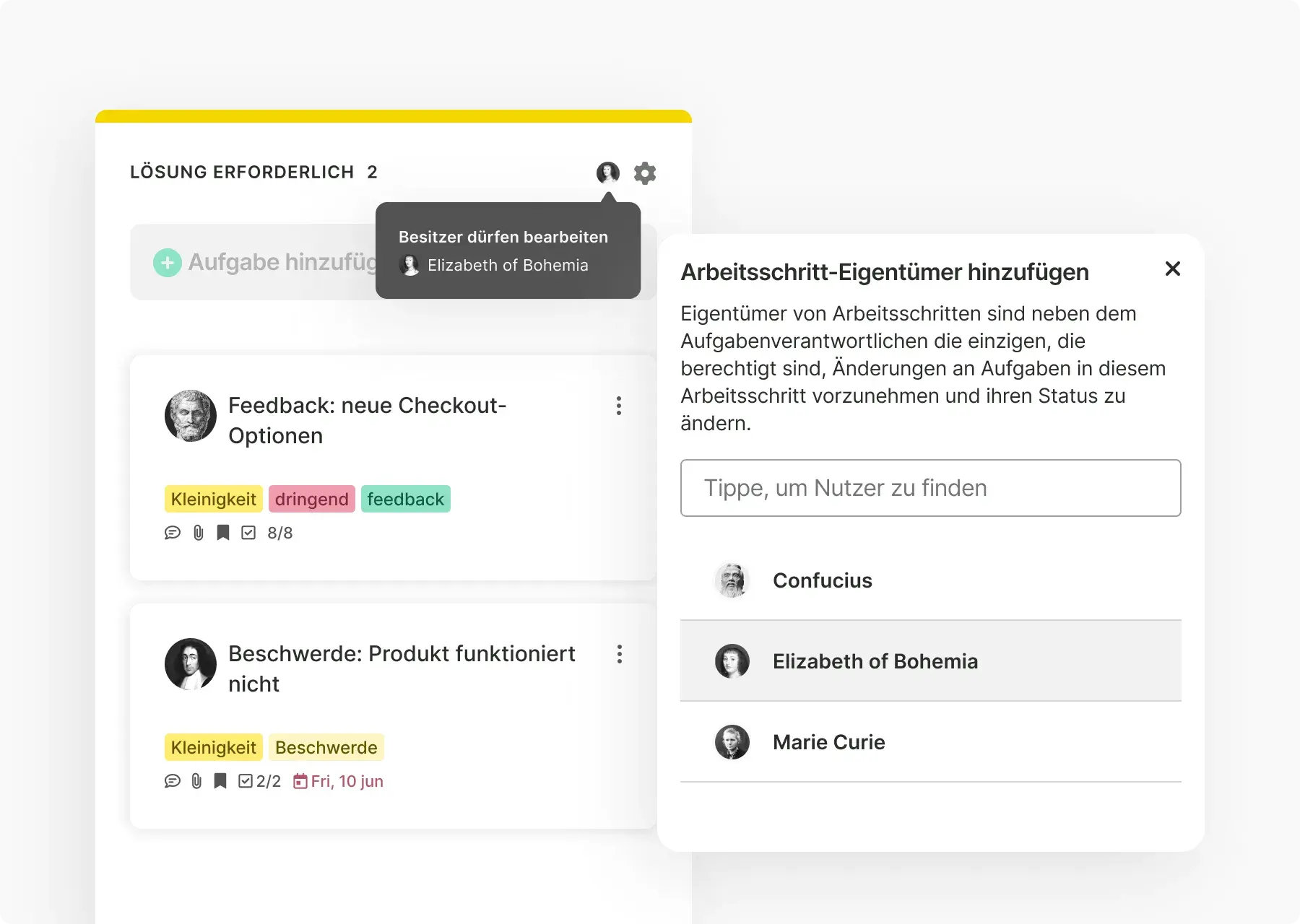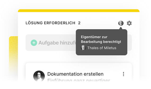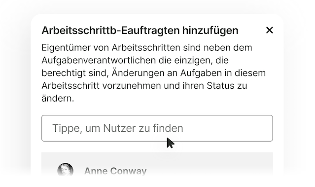 Wer trägt die Verantwortung? Wer ist zuständig für den Prozess und verantwortlich für vorhersehbare, positive und effiziente Ergebnisse, die die Bedürfnisse der Kunden erfüllen? Unsere App bietet die Möglichkeit, die Verantwortung auf Workflow- und Arbeitsschrittebene zu übernehmen, sodass du nie im Dunkeln tappst.