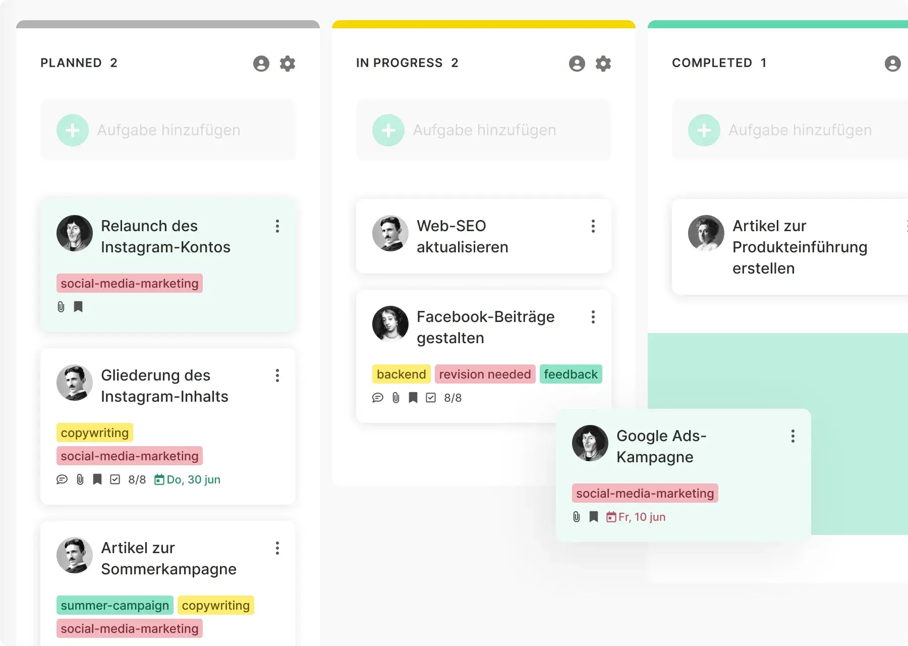 Sofortiger Überblick über jede Aufgabe im Marketingprozess direkt auf deinem Taskboard. Unsere Funktion für eingefrorene Aufgaben zeigt die Engpässe, unsere Kalenderansicht die Fälligkeitstermine. Alles mit einem Mausklick.