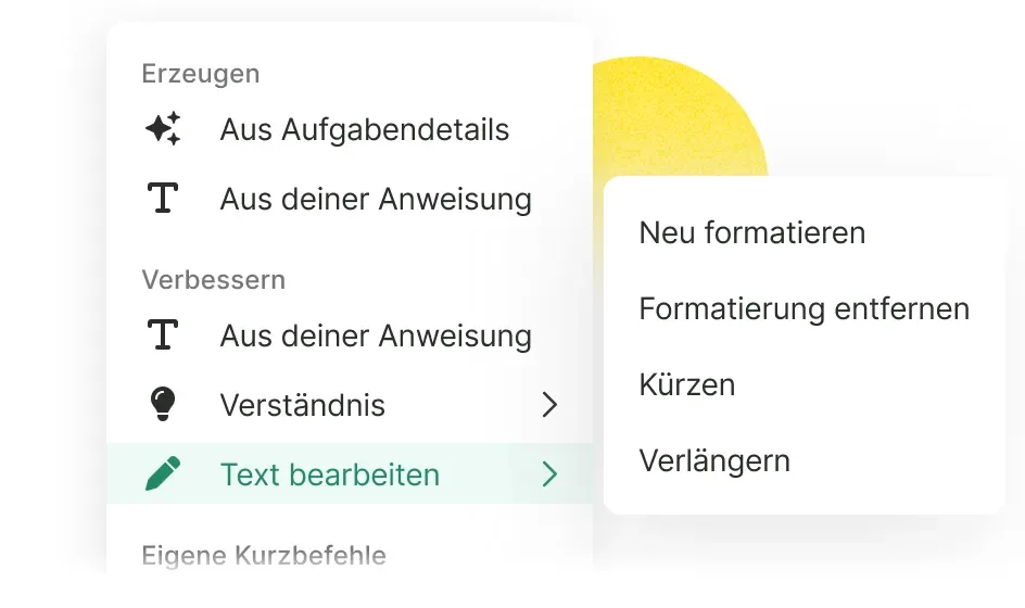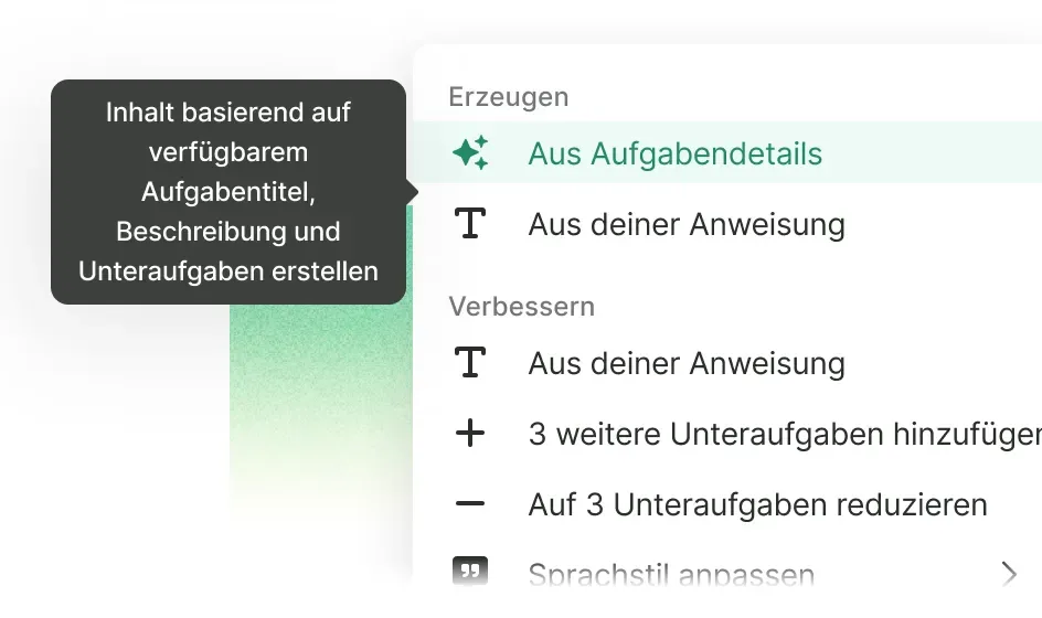 Zerlege komplexe Marketingkampagnen in überschaubare Schritte und sorge dafür, dass jeder Aspekt genauestens ausgeführt wird. Erleichtere eine klare Aufgabendelegation, indem du Schritt für Schritt die Zuständigkeiten der einzelnen Teammitglieder festlegst. Ob es um Projektplanung, Aufgabendelegation oder die Erstellung von Schulungsmodulen für dein Marketingteam geht, unsere KI-Funktionen sind deine Geheimwaffe für den Erfolg.