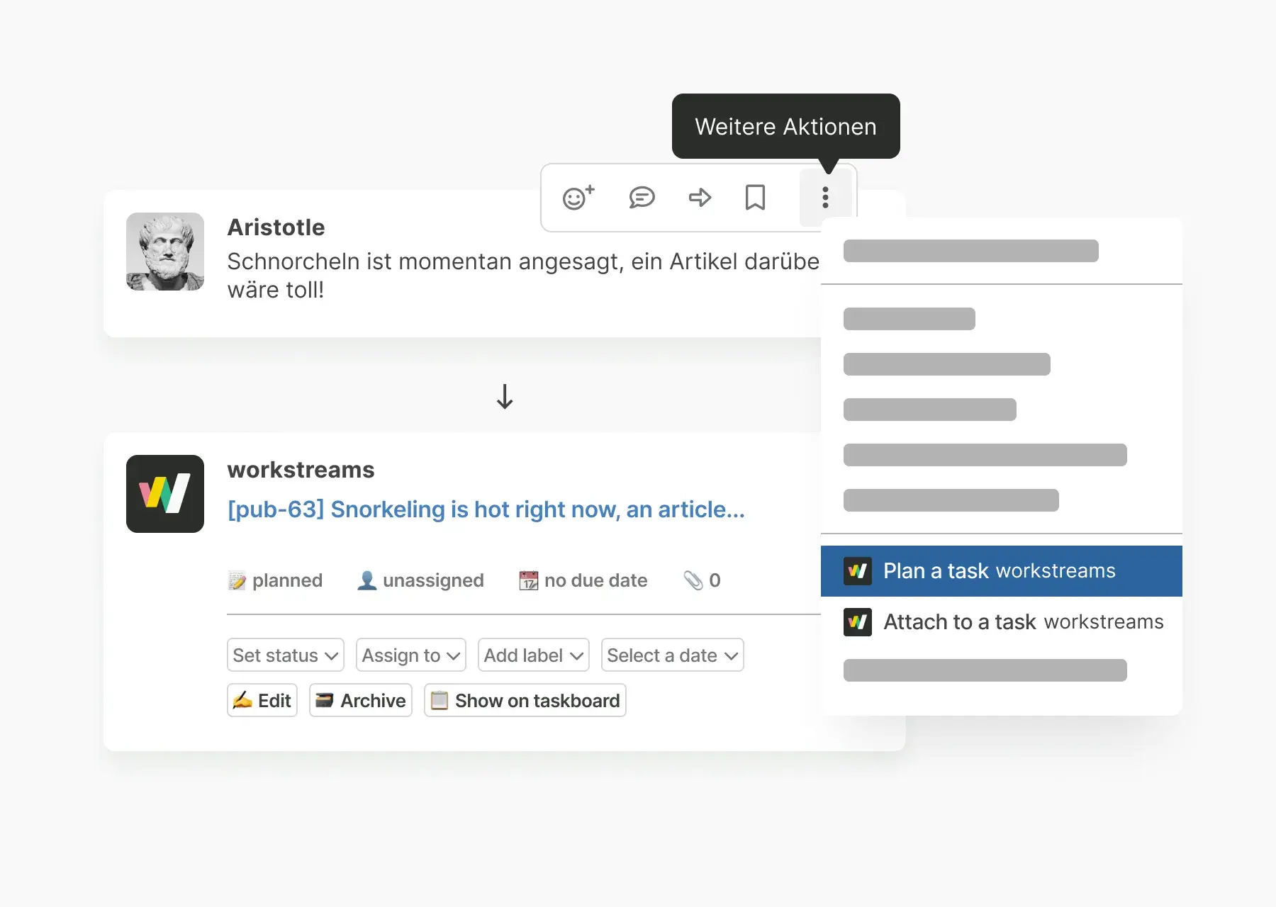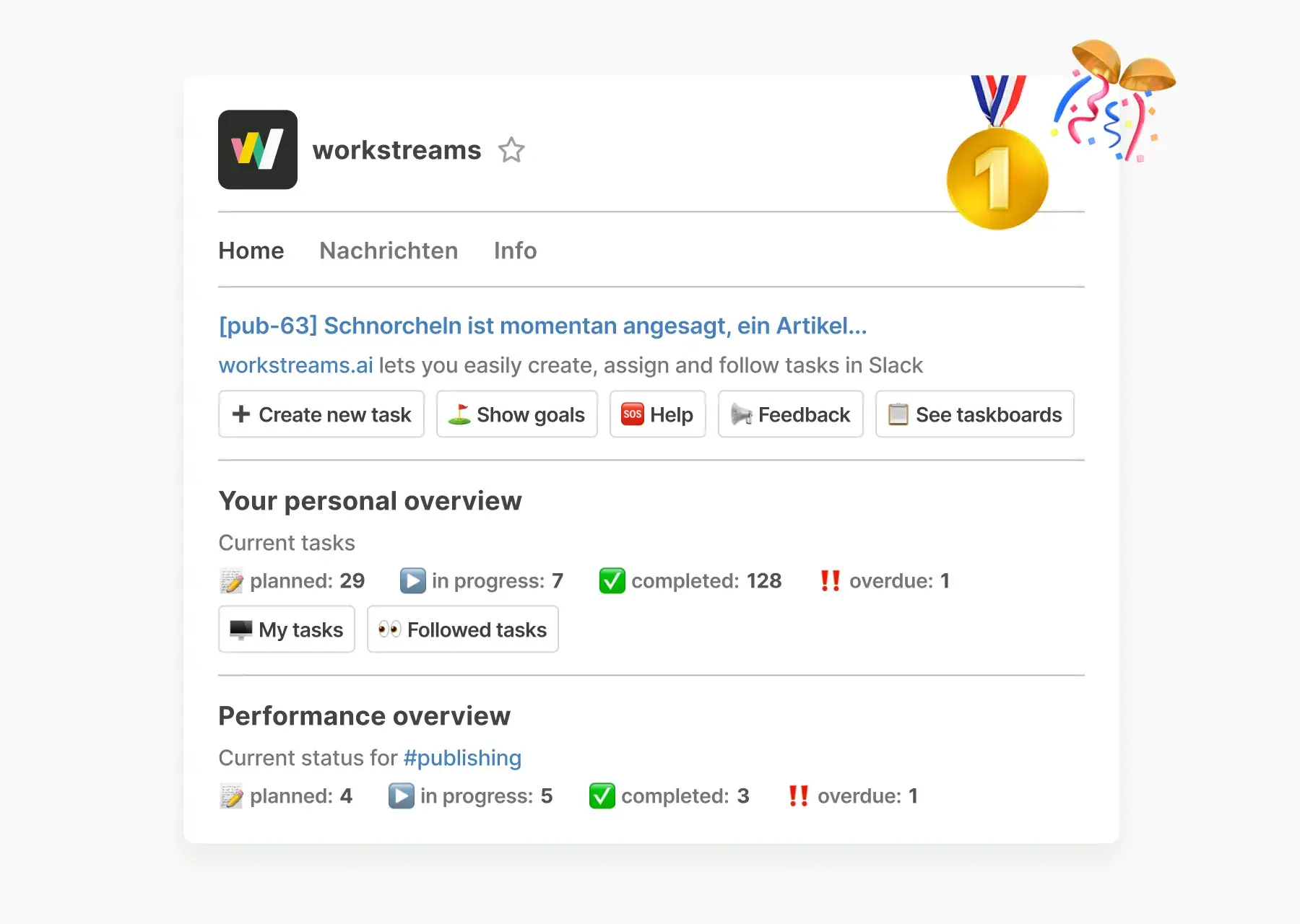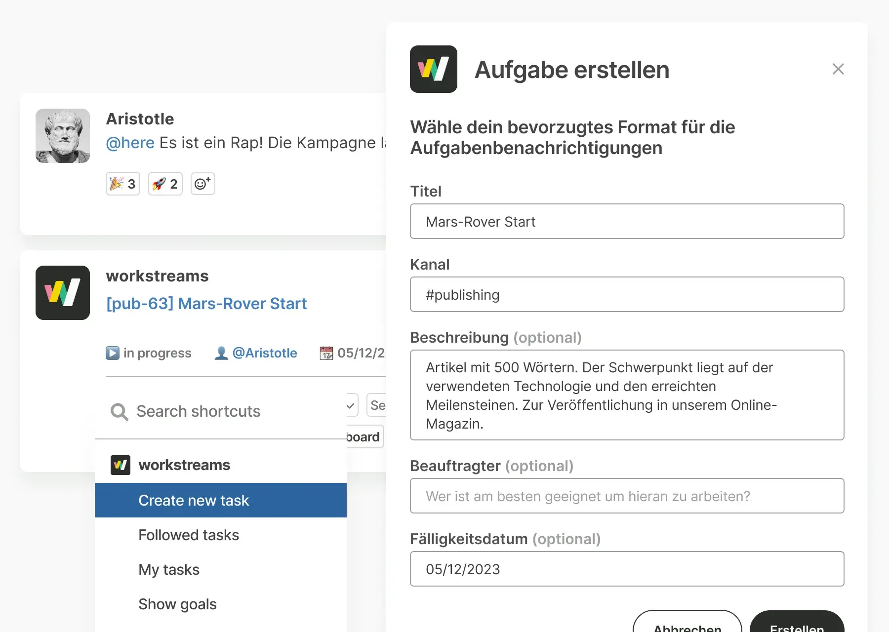 Das Erstellen einer Aufgabe in Slack ist denkbar einfach. Verwende einfach unsere clevere Funktion „Shortcut ⚡️“ und wähle „Aufgabe erstellen“. Alle Workstreams.ai-Aufgaben können innerhalb von Slack vollständig angezeigt und bearbeitet werden. Du musst nicht zwischen den Kontexten wechseln, sondern kannst sofort mit der Aufgabenerstellung beginnen!