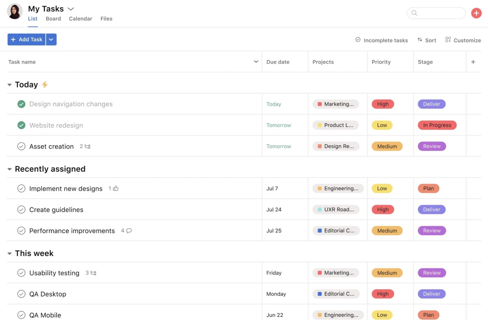 A Asana é um software de gerenciamento de projetos mais complexo que você pode usar além da organização de tarefas. Ela também é melhor para colaboração e comunicação. Enquanto o Todoist tem um layout baseado em lista por padrão, na Asana você pode escolher entre diferentes layouts: Kanban, grade, visualização de calendário, lista de tarefas, etc.