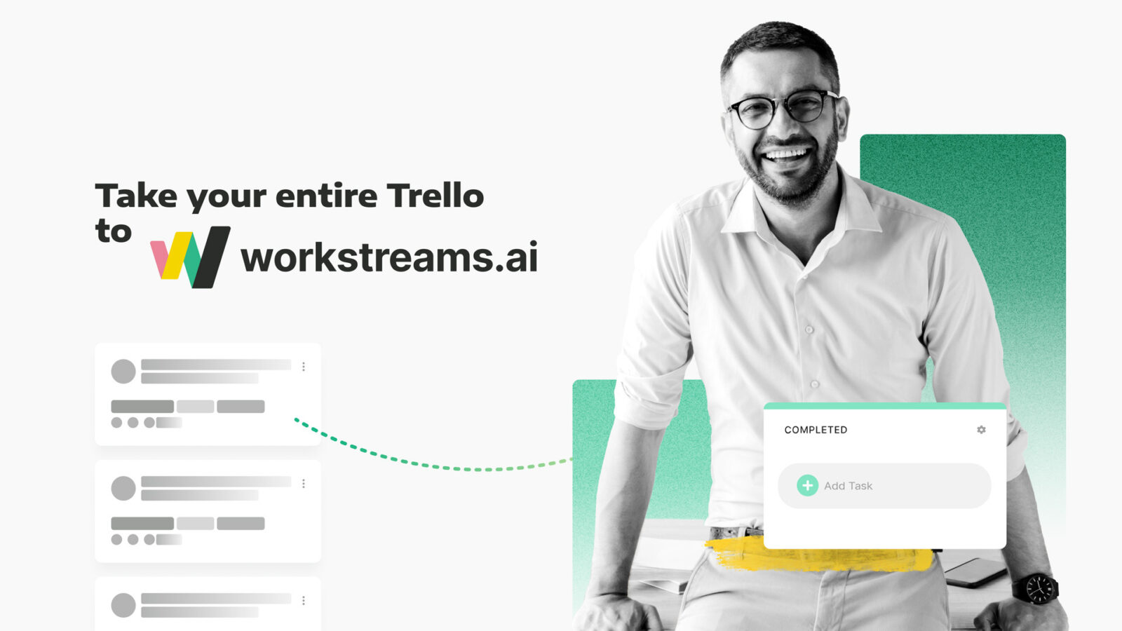 Mas e se suas tarefas já estiverem em um lugar diferente na web? E se você for um usuário Trello, procurando uma maneira fácil de pular a bordo do trem da workstreams.ai? É aí que entra nossa integração com o Trello!