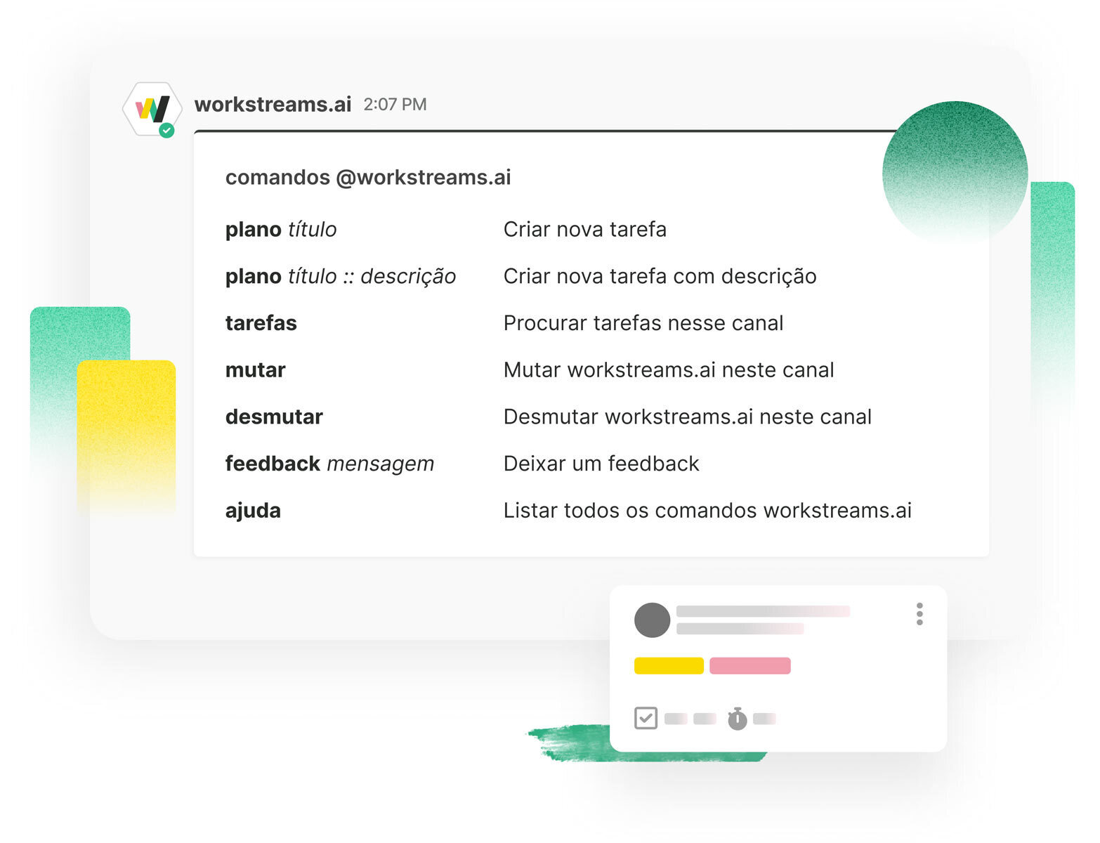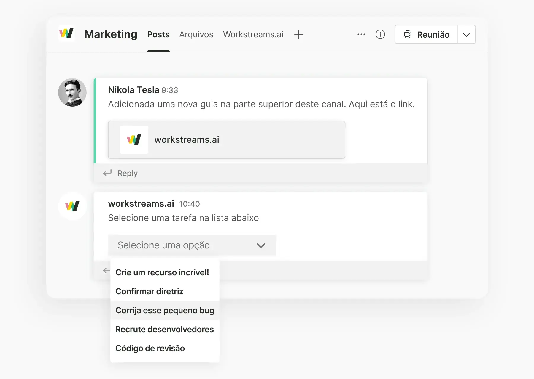 Criar uma tarefa no MS Teams é fácil. Vá para o canal onde você deseja adicionar uma tarefa. Digite @workstreams.ai plan [nome da sua tarefa]. Pressione Enter e a tarefa será criada em sua conversa. O bot da workstreams.ai mostra os detalhes da tarefa no canal e define o status como planejado. Você pode editar a tarefa a partir dessa mensagem.
