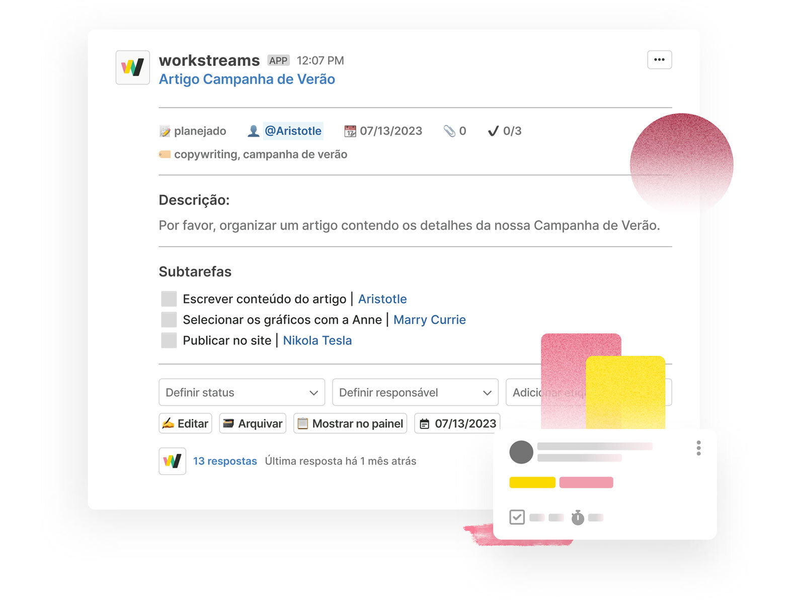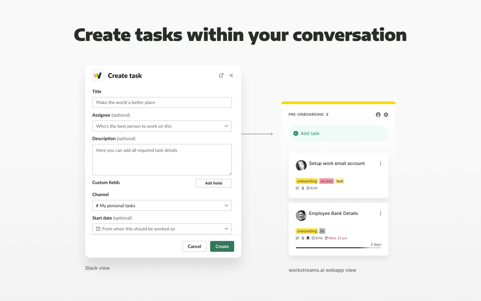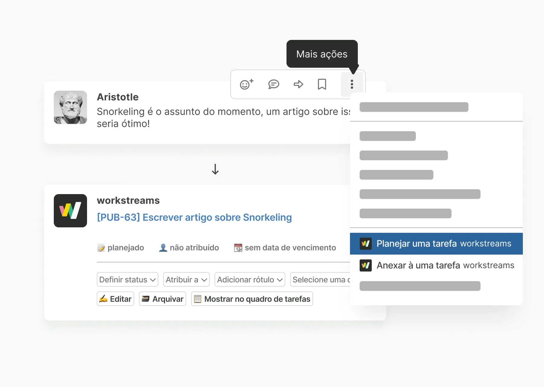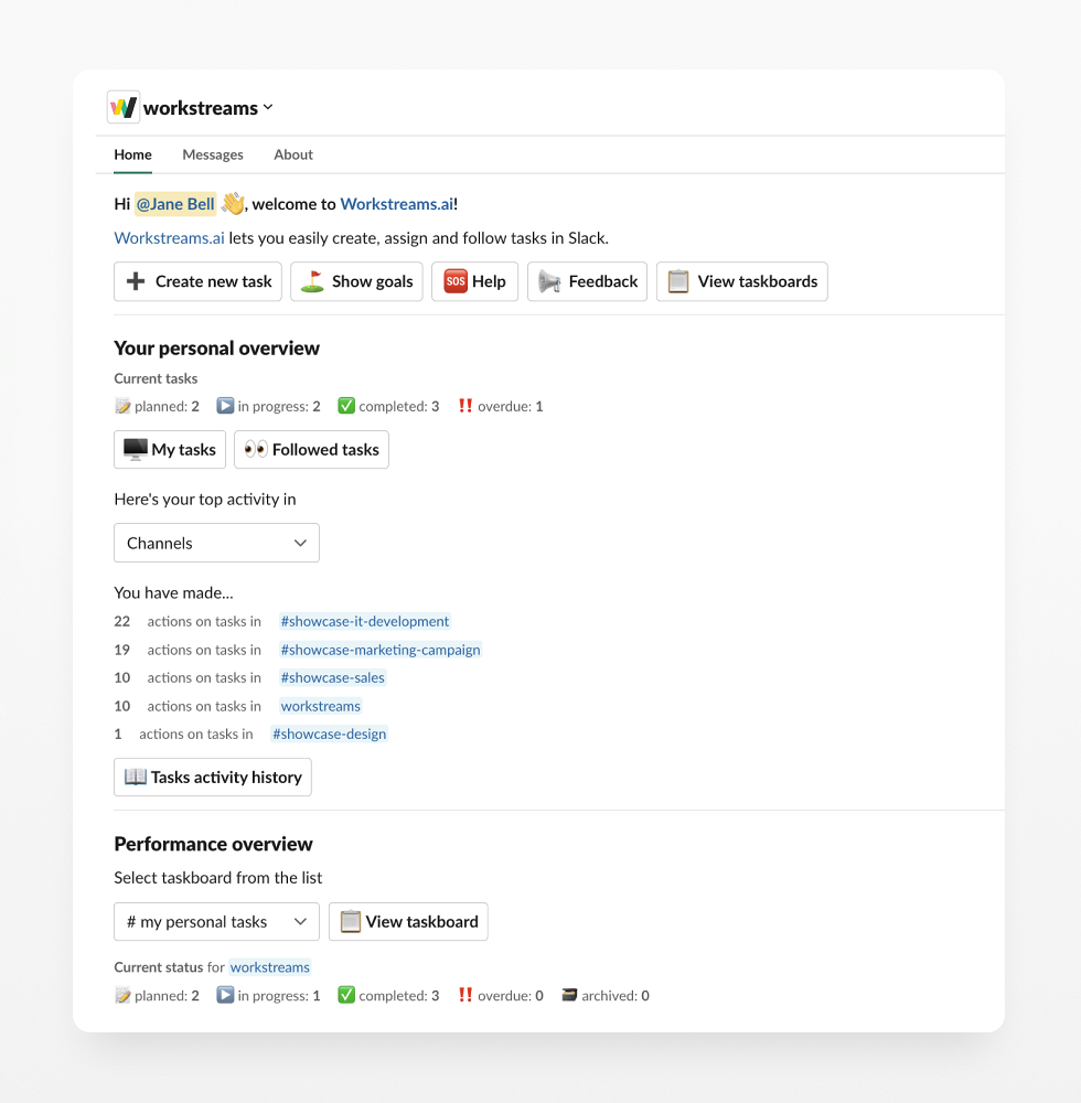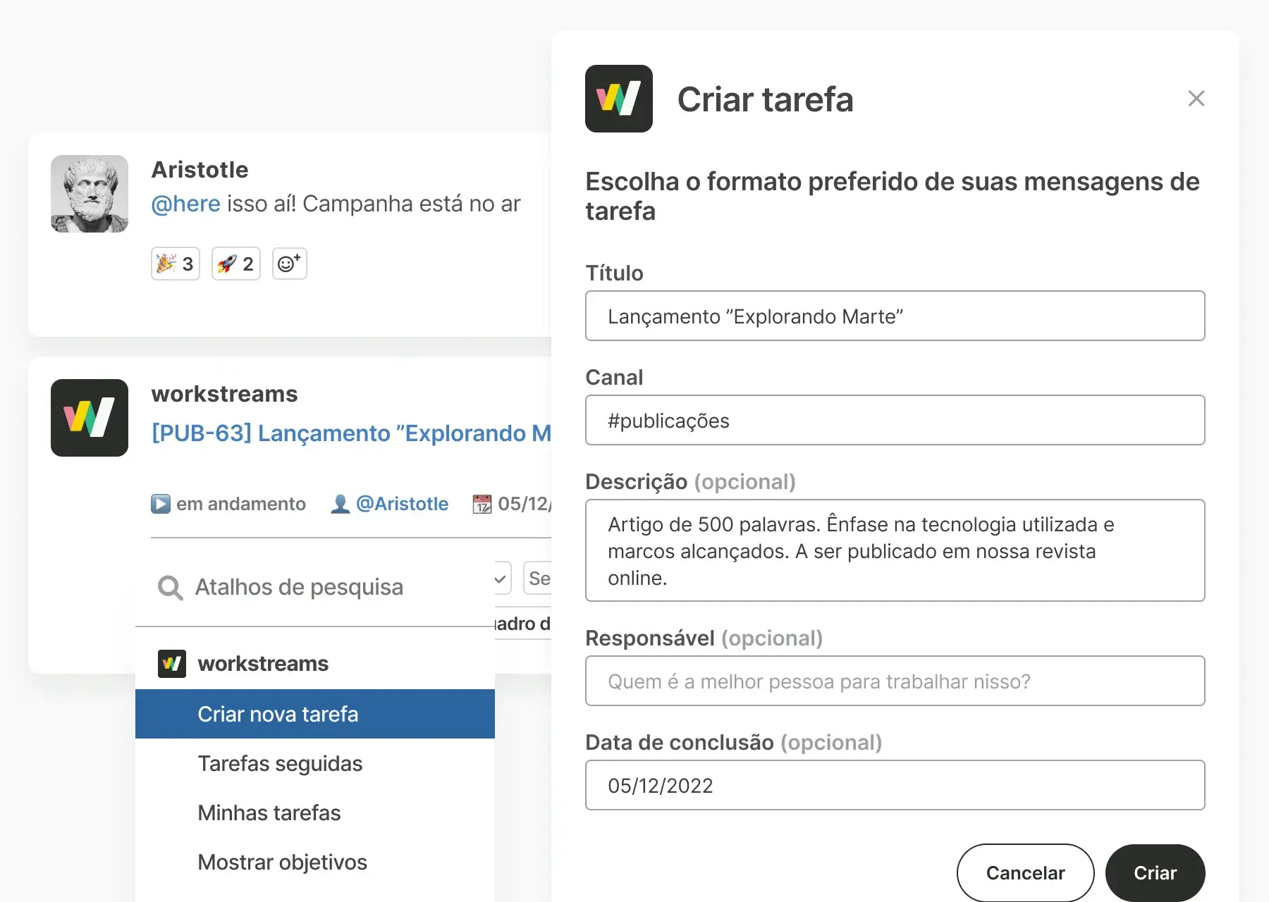Criar uma tarefa no Slack é extremamente fácil. Basta usar nosso recurso de atalho ⚡️ e escolher "Criar uma tarefa". Todas as tarefas da workstreams.ai podem ser totalmente visualizadas e trabalhadas no Slack. Não há necessidade de alternar contextos. Você pode começar a criar tarefas imediatamente!
