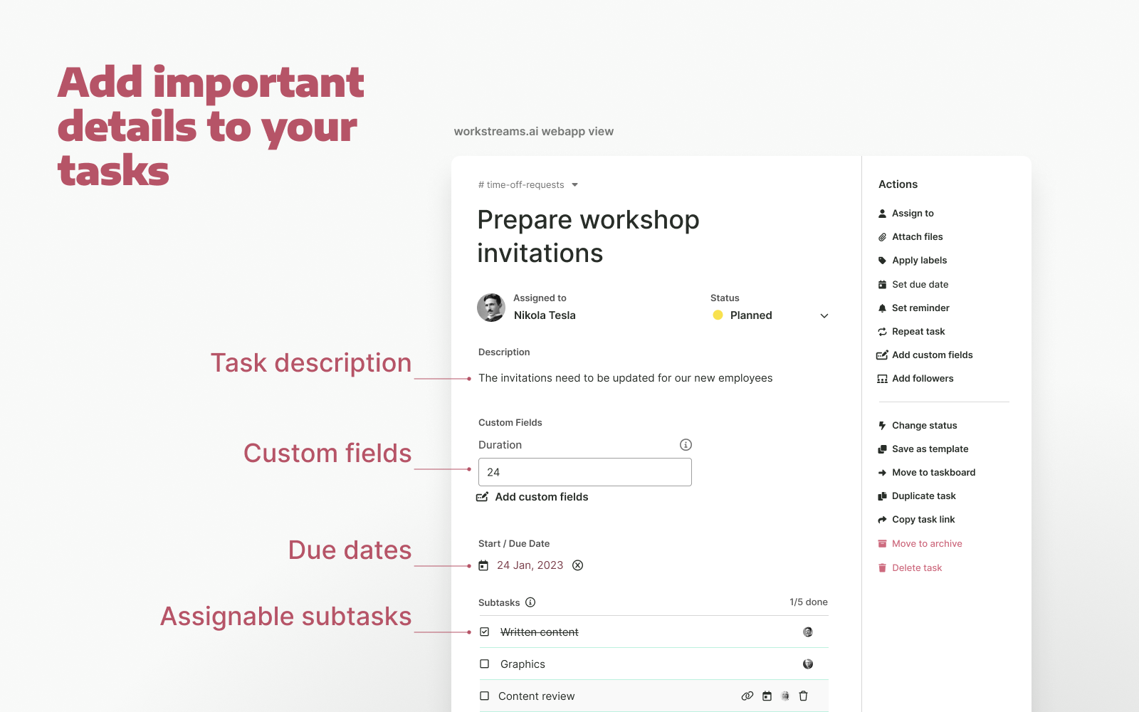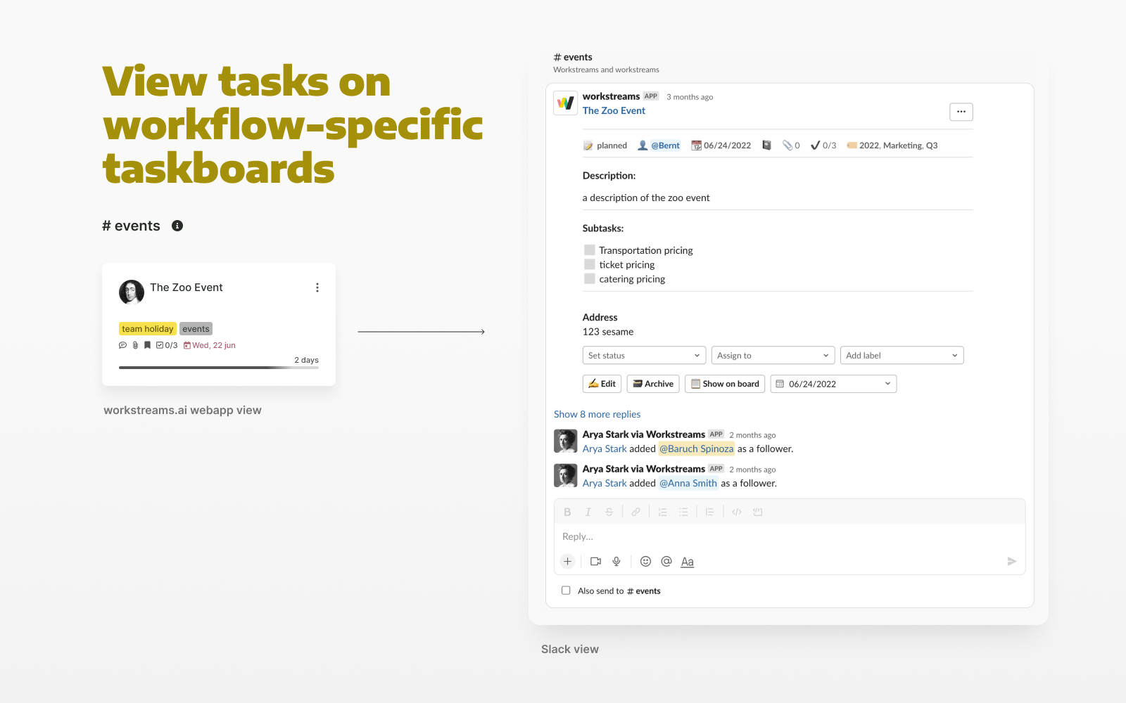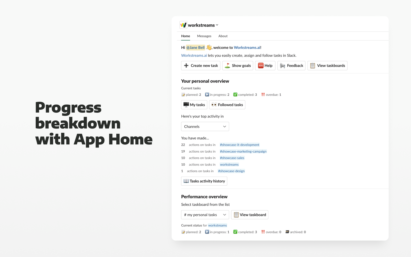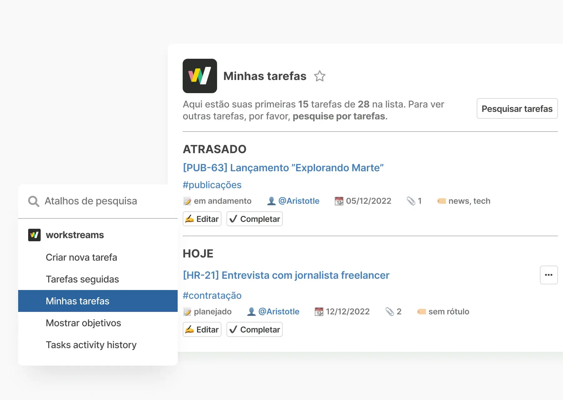 Criar uma tarefa no Slack é extremamente fácil. Basta usar nosso recurso de atalho ⚡️ e escolher "Criar uma tarefa". Todas as tarefas da workstreams.ai podem ser totalmente visualizadas e trabalhadas no Slack. Não há necessidade de alternar contextos. Você pode começar a criar tarefas imediatamente!