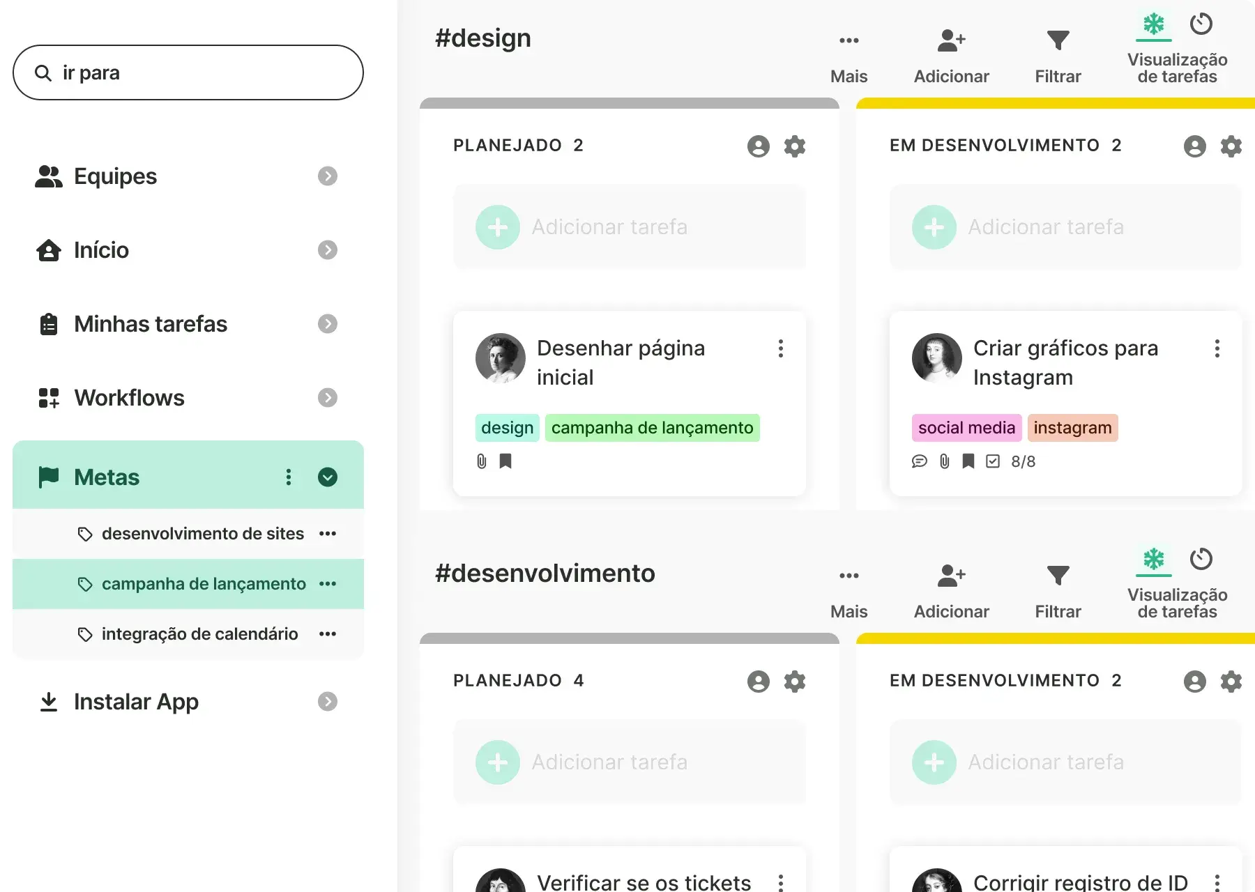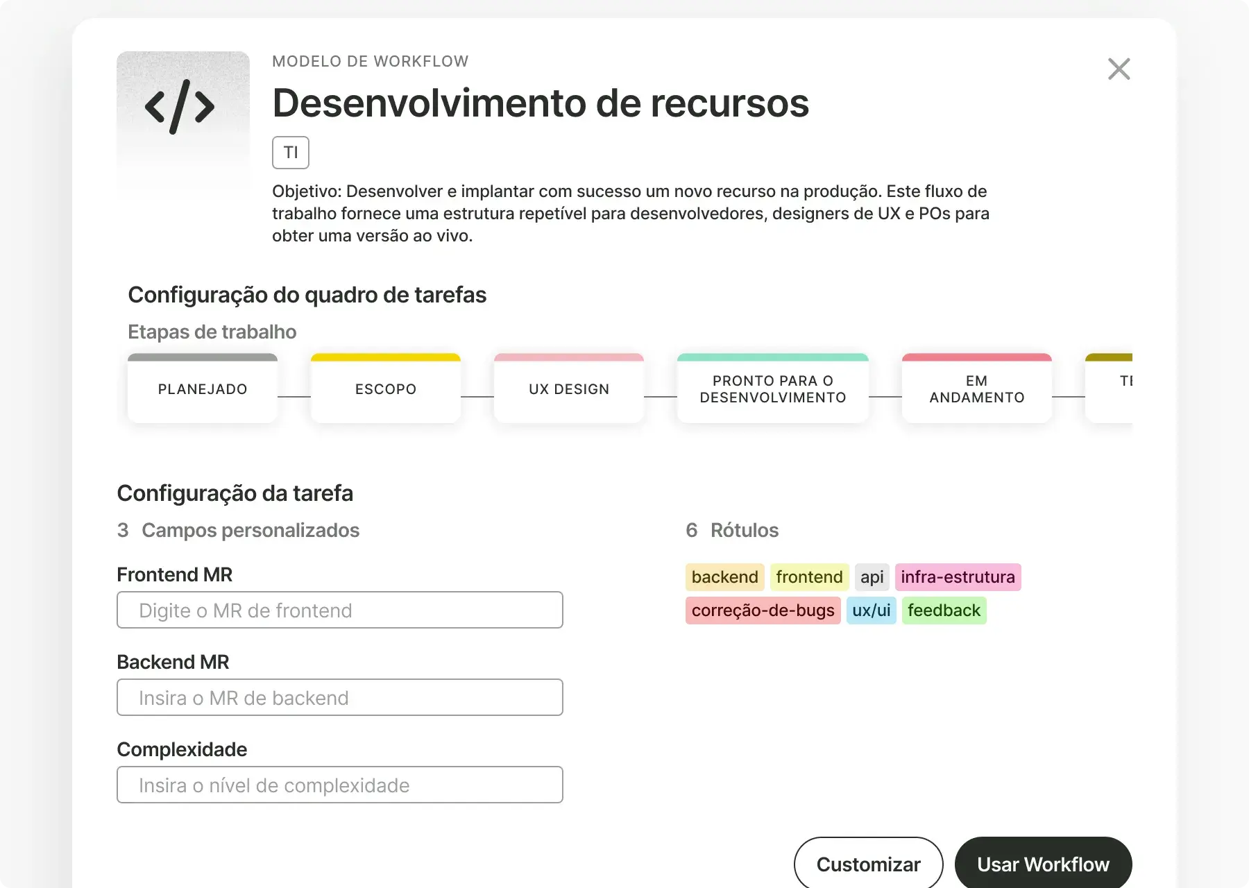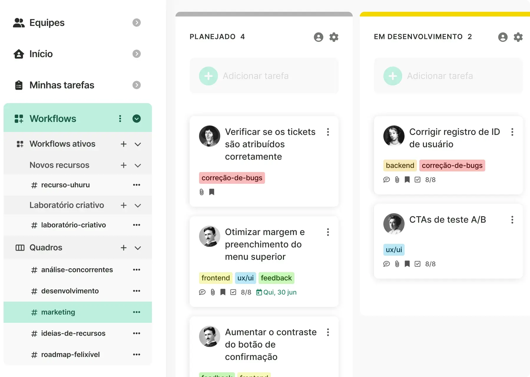 Configure workflows para melhorar uma característica em seu produto. Atribua tarefas de design, código de escrita e controle de qualidade aos membros certos da equipe sempre que necessário. Rotule tarefas para colocar seu trabalho em produção em velocidade máxima.