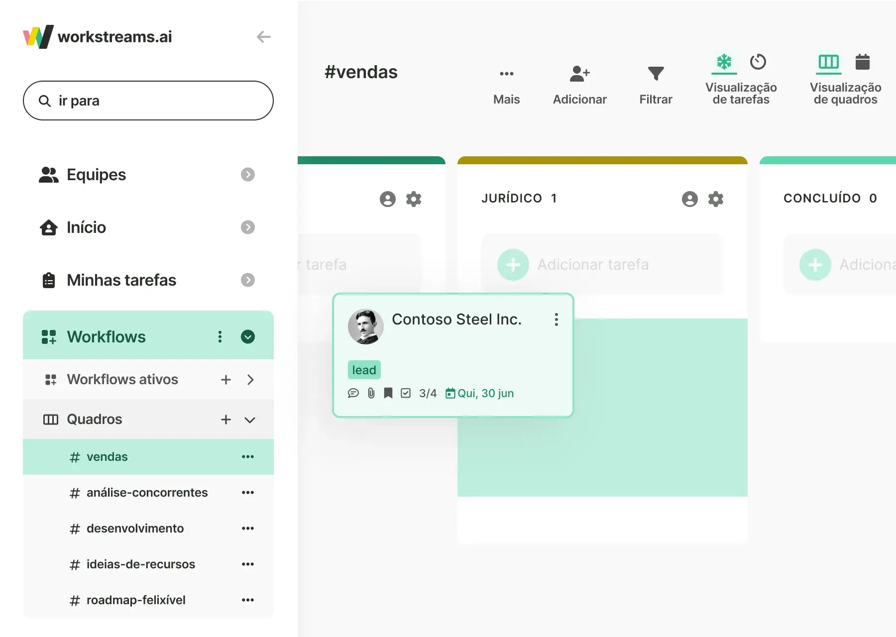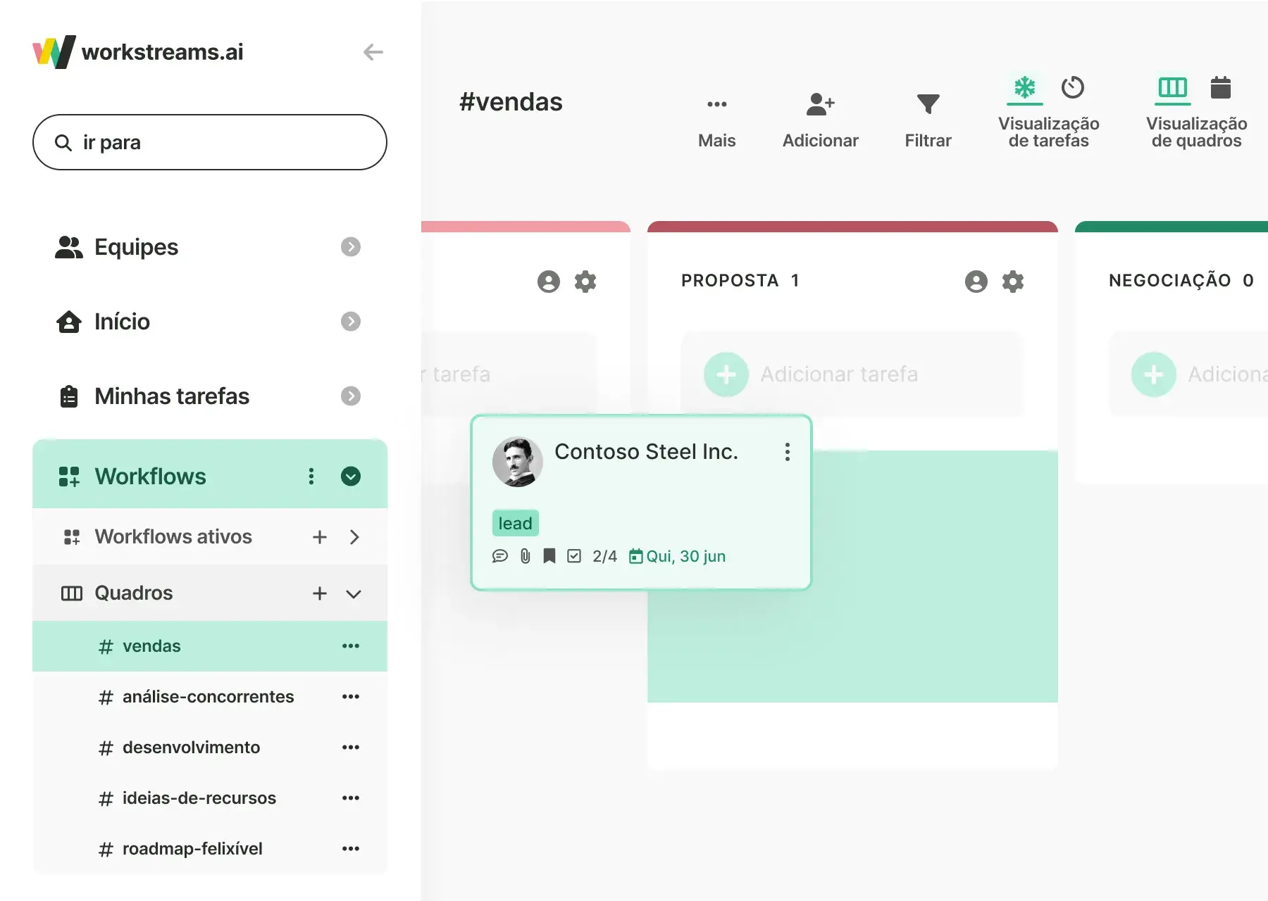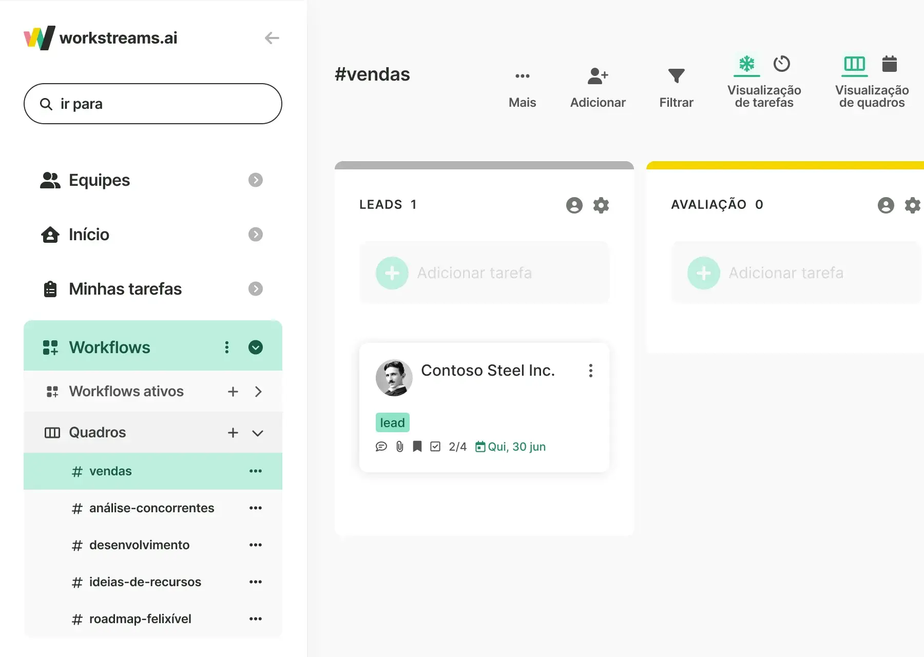 A troca de contextos é um entrave. Isso também contribui diretamente para a perda de tempo e foco. A workstreams.ai coloca seu processo de vendas diretamente onde sua equipe se comunica. Qualquer problema é resolvido com seus colegas de equipe em segundos, permitindo que você se concentre no lead em questão.