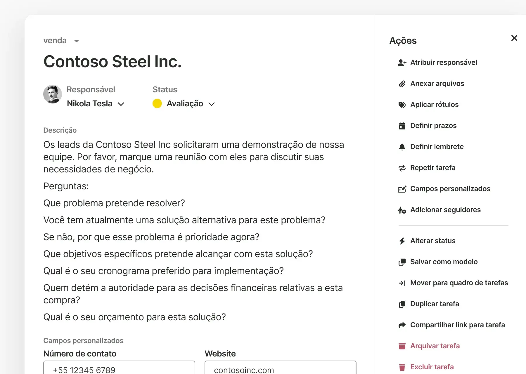 Crie sua primeira tarefa no workflow! Digite N ou simplesmente use o modelo de tarefa. A Contoso Steel Inc é o prêmio. Adicione alguma descrição sobre o lead. Atribua-o a um membro da sua equipe de vendas. Prontinho!